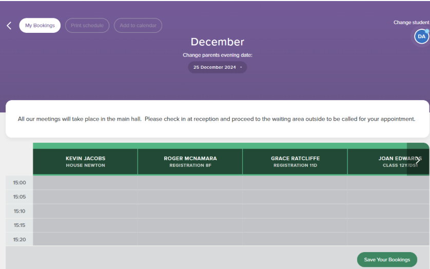 The child you are booking for will show in the top right-hand corner of the screen. If you have more than one child at our school, you will see a circle for each child. Simply click on the relevant circle to select the child you want to make a booking for.