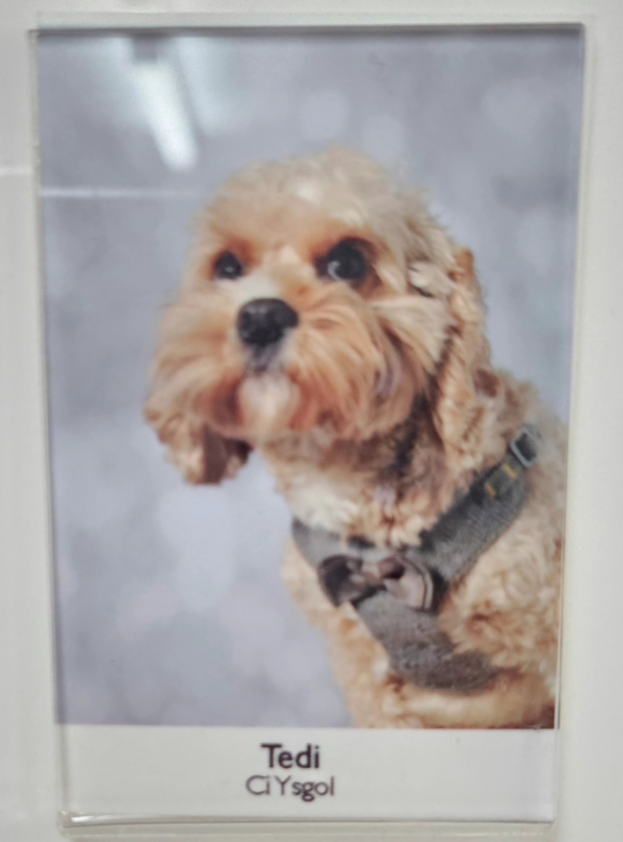 Cavapŵ 4 oed yw Tedi a ymunodd â ni ym mis Medi 2021 pan oedd ond yn 6 mis oed. Mae Tedi yn gweithio’n rhan-amser ac yn treulio ei ddyddiau yn Y Cwtch ac Enfys yn Y Caban. Mae’n hoff iawn o chwarae ar cae chwarae yr ysgol gyda’r disgyblion yn ystod amser chwarae ac mae’n mwynhau cwtsho i fyny i wrando ar stori dda.